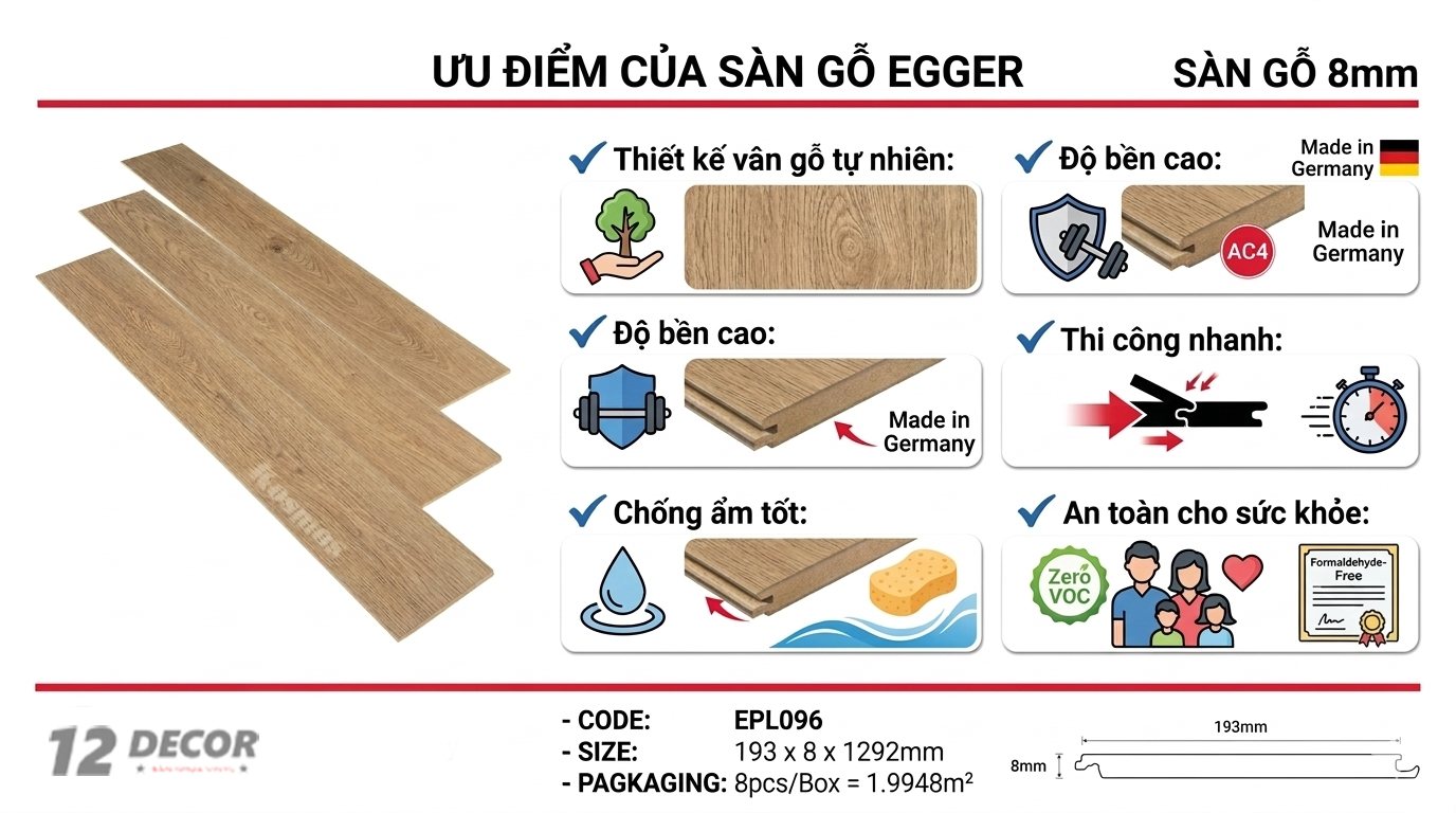 Sàn gỗ Egger là dòng sàn gỗ công nghiệp cao cấp được sản xuất theo tiêu chuẩn Châu Âu, nổi bật với độ bền cao, khả năng chịu lực tốt và thiết kế vân gỗ tự nhiên.