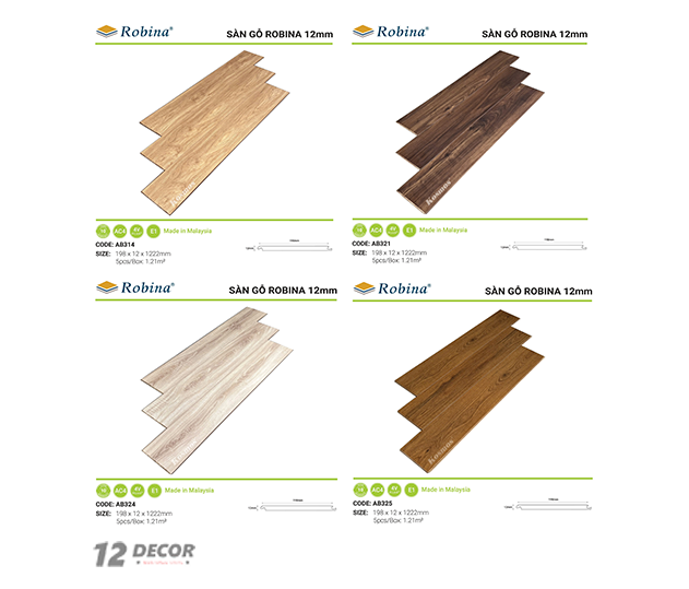 Hiện nay, sàn gỗ Robina phổ biến với độ dày 12mm, mang lại cảm giác chắc chắn khi sử dụng và phù hợp với các khu vực có mật độ đi lại cao.