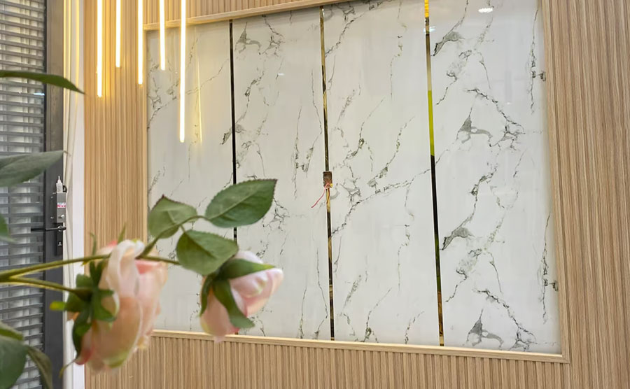 Tấm vân đá PVC2001 có thể ứng dụng trang trí ở nhiều không gian khác nhau, từ phòng khách, phòng ngủ, phòng bếp đến phòng tắm,…