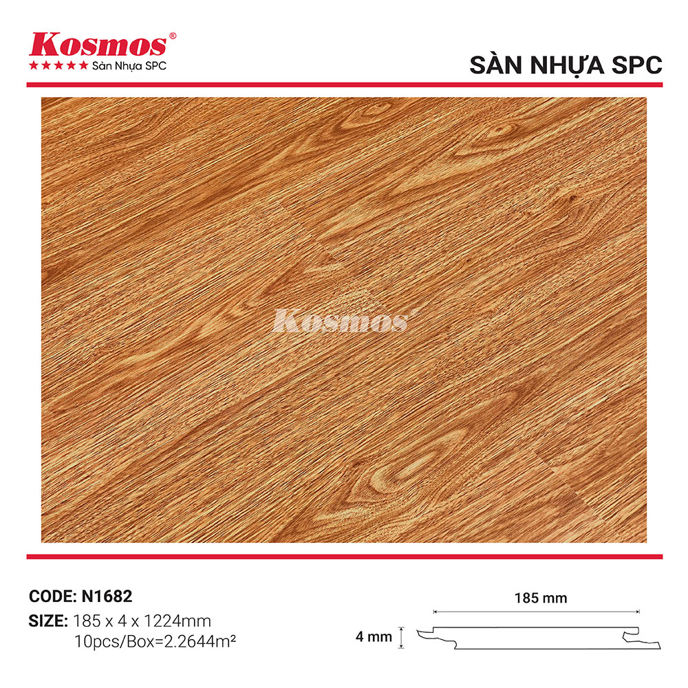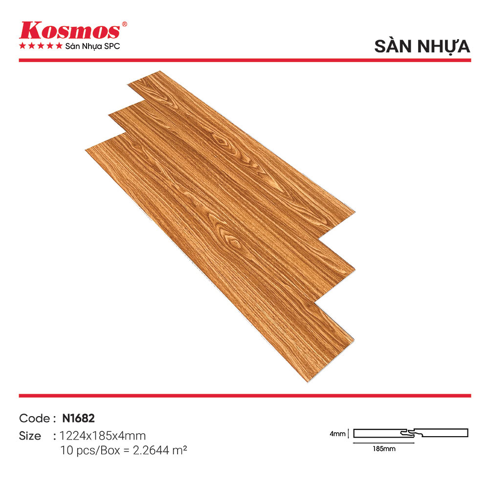 Sàn nhựa hèm khóa Kosmos N1682 là sản phẩm mới nhất của thương hiệu Kosmos, được sản xuất trên dây chuyền công nghệ hiện đại, đạt tiêu chuẩn chất lượng quốc tế. Sàn nhựa có thiết kế vân gỗ nâu đậm, mang đến vẻ đẹp sang trọng và hiện đại cho ngôi nhà của bạn.