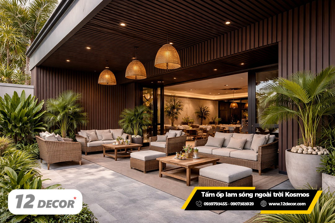 Tấm ốp lam sóng ngoài trời Kosmos là dòng lam sóng gỗ nhựa 2 da cao cấp (Co-extrusion WPC), mang đến vẻ đẹp sang trọng như gỗ tự nhiên nhưng bền bỉ vượt trội tại Cần Thơ.