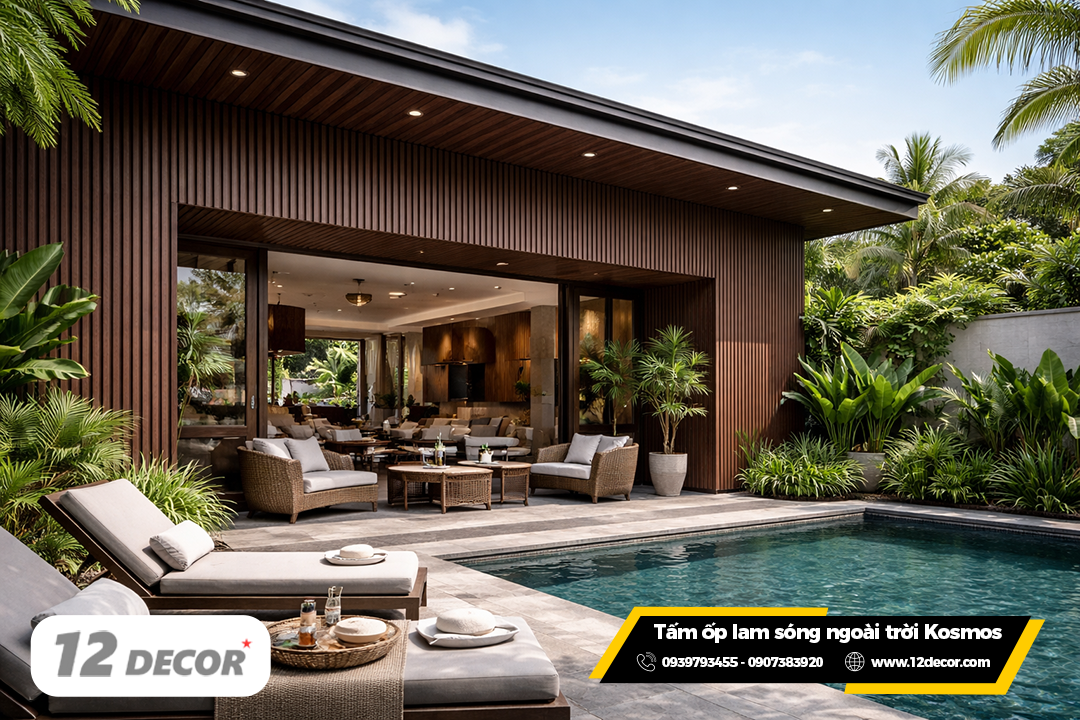 Tấm ốp lam sóng ngoài trời Kosmos là dòng lam sóng gỗ nhựa 2 da cao cấp (Co-extrusion WPC), mang đến vẻ đẹp sang trọng như gỗ tự nhiên nhưng bền bỉ vượt trội tại Cần Thơ.