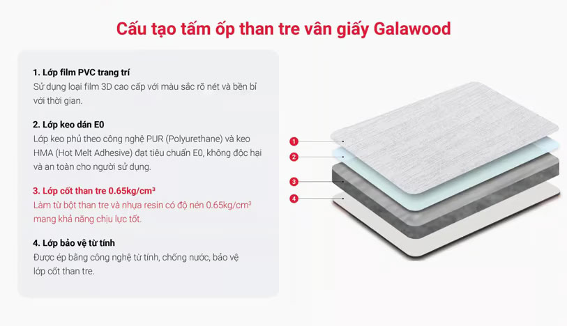 Cấu tạo 4 lớp của tấm ốp than tre G-881 Galawood chính là bí quyết tạo nên sự bền bỉ và tính thẩm mỹ vượt trội.