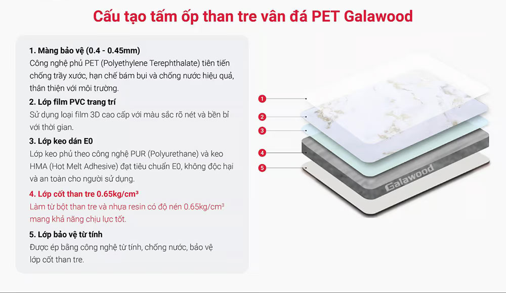 Tấm ốp tường/ốp trần than tre vân đá trắng PET G-885 có cấu tạo gồm 5 lớp chính: