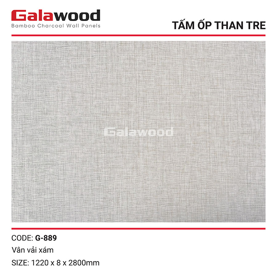 Tấm ốp than tre vân vải G-889 Galawood sở hữu màu xám thanh lịch. Kích thước chuẩn của sản phẩm là 2800 x 1220mm với độ dày 8mm, quy cách 3.416m²/tấm. Trọng lượng mỗi tấm ốp rơi vào khoảng 17kg với sai số tiêu chuẩn ±10%.